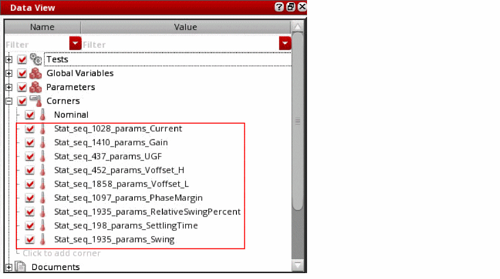 A statistical corner is generated for each specification in the setup. These corners can be viewed in the Data View assistant and the Corner Setup form. The naming convention for these corners is Stat_seq_Worst_corner_number_params_Specification_name.