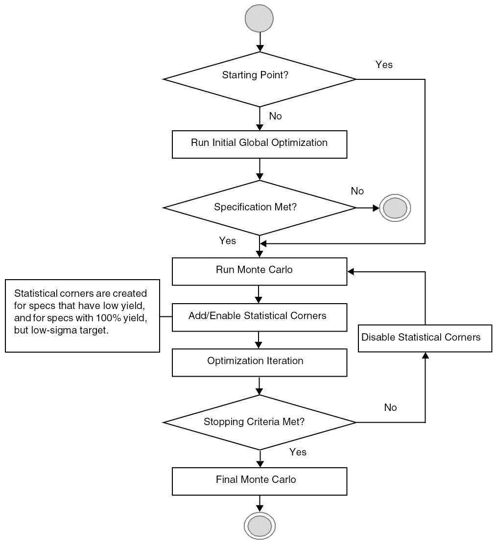 The Improve Yield run mode runs iterations of sizing and Monte Carlo analysis to arrive at a solution. When you start the Improve Yield run, Virtuoso Variation Option first generates the statistical corners, then, as the run progresses, evaluates points on a subset of those corners. Promising points are then evaluated on a larger set of corners. Eventually, the tool arrives at the best point—one that has been evaluated at all statistical corners and has the highest possible yield.