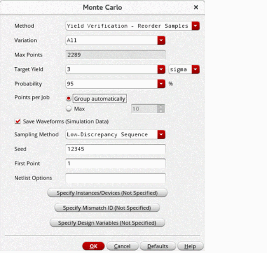 This value depends on both the Target Yield and Probability. The number of simulations required is typically much smaller. - In the Target Yield field, specify the yield value that you want to achieve for your design. The target yield can be specified in either sigma or percentage