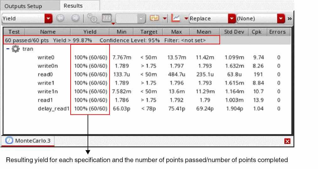 The Yield view of the Results tab displays the results of the Monte Carlo run for the Yield Verification - Reorder Sample method.