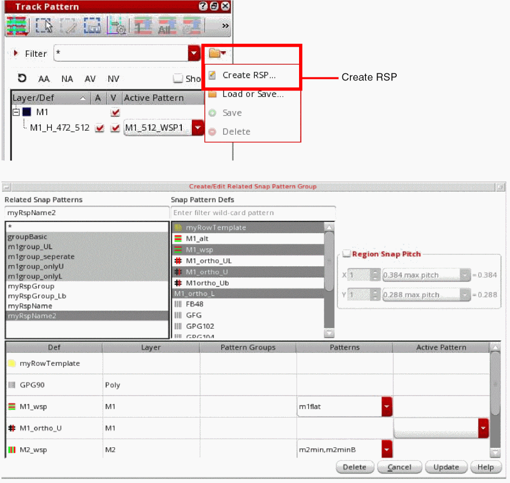 You can select the snap pattern defs for a related snap pattern. You can also delete a selected RSP using the Delete button.