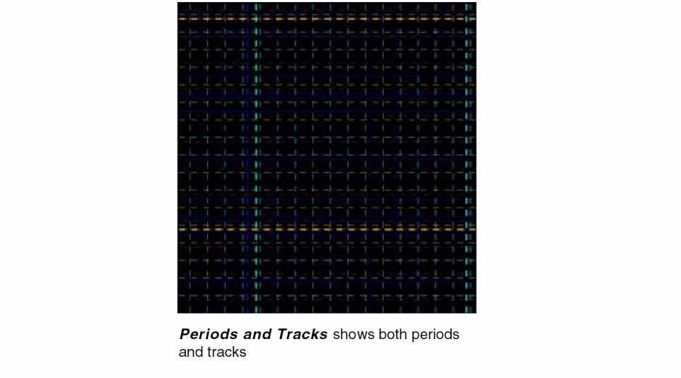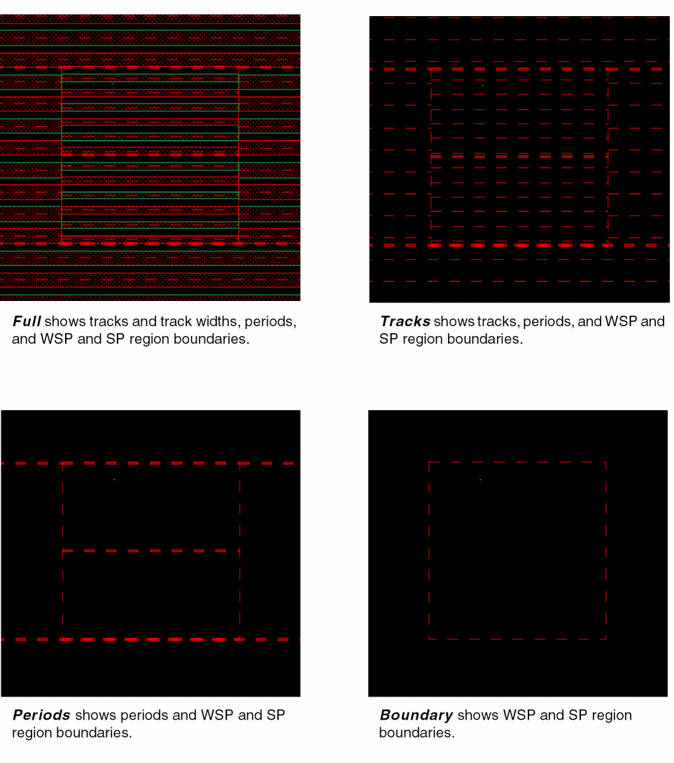 Click the track pattern Display Mode icon on the toolbar in the Track Pattern assistant to control the display of boundaries and track elements in the canvas. You can choose one of the following from the list: Full, Tracks, Boundary, Periods, and Period and Tracks.