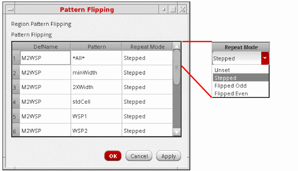 Choose the default repeat mode or individual pattern repeat modes for the region as one of the following: Stepped, Flipped Odd, or Flipped Even from the respective row in the Repeat Mode column. Unset restores the value to the global grid repeat mode for a WSSPDef, or to the default for the WSSPDef if you are unsetting an individual pattern. - Click OK or Apply to set the changes.