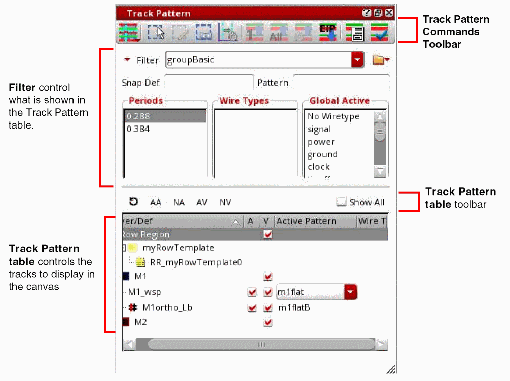 - The bottom section shows the Track Pattern table of active patterns for WSSPDefs and SPDefs grouped by layer with display controls to show or hide the active patterns in the canvas. For more information, see Specifying the Active Patterns.