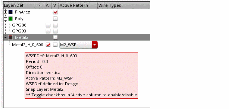 The WSSPDef name, period, offset, direction, active pattern, and snap layer are displayed.