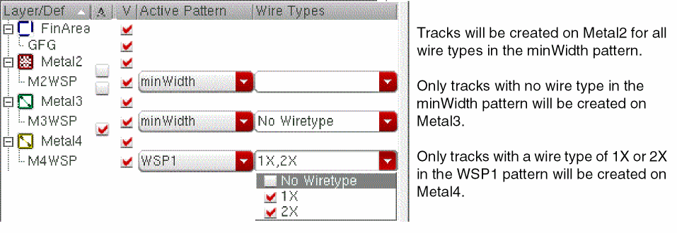 The active pattern specifies the width and spacing for a set of tracks. Each track can have an optional wire type. If Wire Types is empty, then tracks will be created in the canvas for all wire types in the active WSP. Otherwise, tracks will be created only for the selected wire types. The following example shows different Wire Types selections for Metal2, Metal3, and Metal4.
