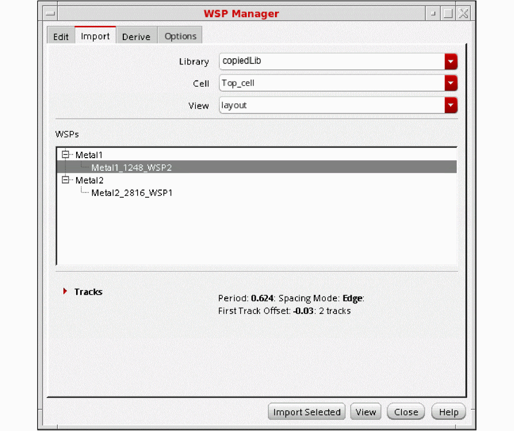 In the Import page of WSP Manager, you specify a cellview from which to import WSPs. Only design WSPs can be imported from another design, not technology library WSPs. Regions are not copied from the other design. You cannot import a design to itself.