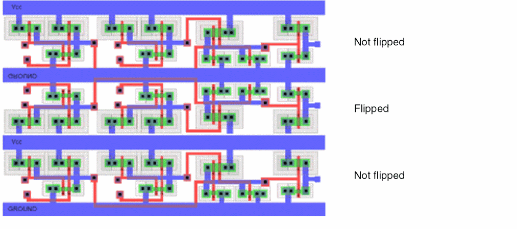 The following example has three rows of devices. The devices in the middle row are flipped. This allows the middle row to share the power rail with the row below it and share the ground rail with the row above it.