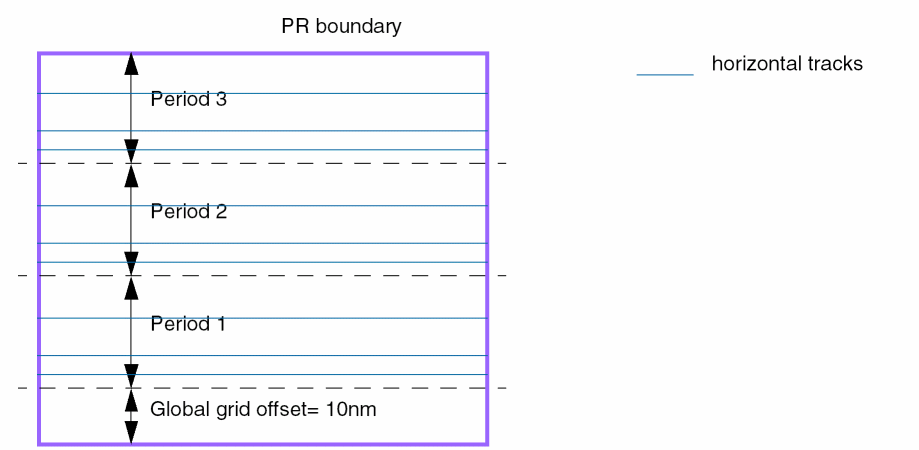 Consider a cellview with a vertical global grid (horizontal tracks) where the offset reference is "boundary" and the global grid offset is 10nm. The bottom edge of the first period is 10nm above the bottom edge of the PR boundary.
