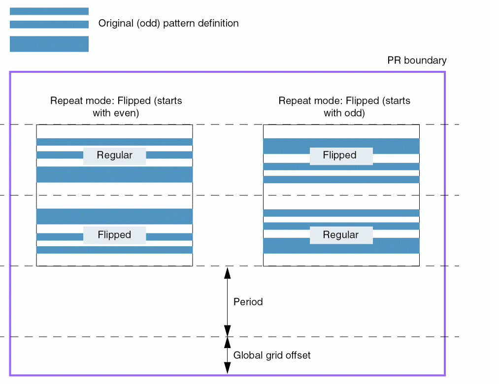 Pattern flipping can be applied to the global grid or to a pattern region and is set with reference to the first period. The first period can be flipped or not flipped, as specified by the repeat mode, and all other periods alternate accordingly.