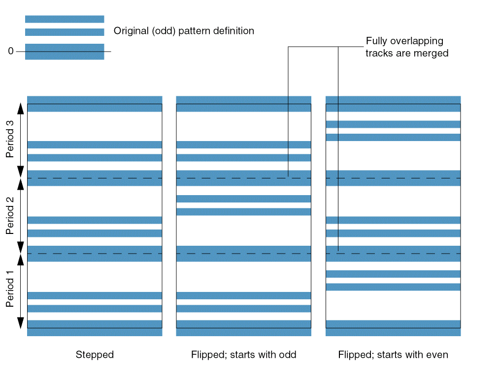 When a pattern has zero offset, the centerline of the first track is located on the period line or the bottom edge of the region. In a legal pattern, the height of the pattern needs to be compatible with the period and the height of the region. Therefore, a track at offset zero is also present on the top period line or the top region boundary. When a pattern with zero offset is flipped, the top and bottom tracks overlap and are merged into one single track.