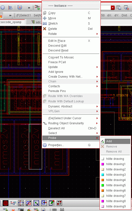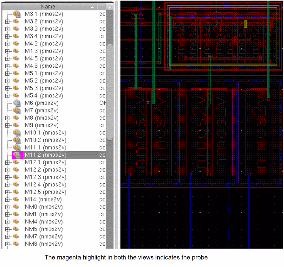 A colored probe is added to the selected object in the layout view. A similar, corresponding probe is also added in the schematic view.