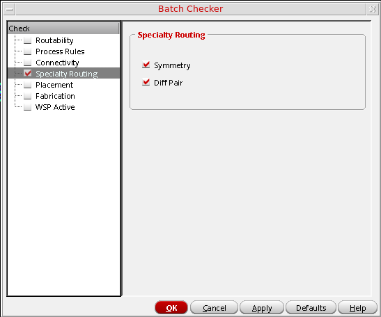 To perform special routing checks on a design, select the Specialty Routing option. The special routing checks are displayed in the right panel of the form as shown in the following figure.
