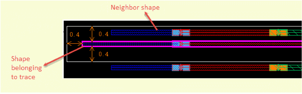 A neighbor is a shape close to a shape belonging to a trace. The Net Tracer lets you find neighboring shapes on the same layer as the traced shape or on any extractable layer. Neighboring shapes need not exist on the same purpose as the traced shape. A neighbor can belong to a different hierarchical level or figGroup.