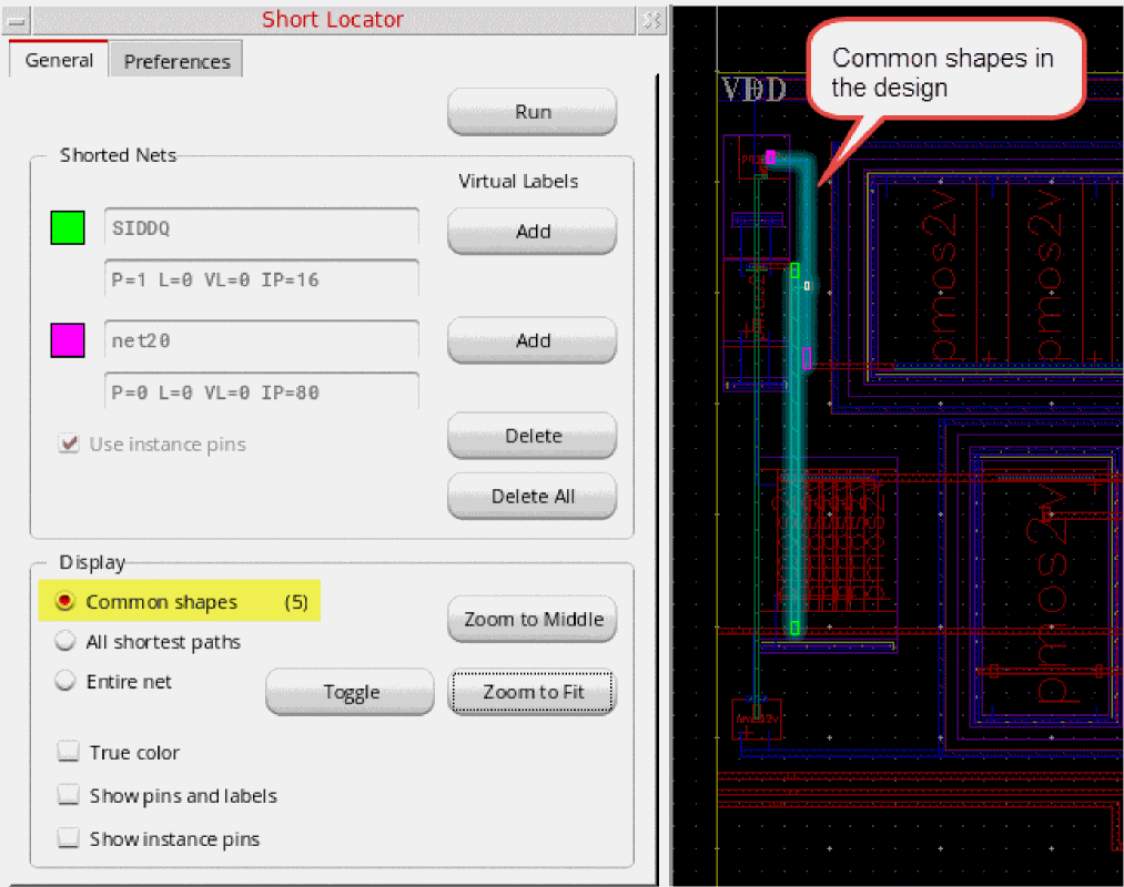 - After the common shapes have been brought down to a few, the shape causing the short can be visually identified. To resolve the short, the shape can be moved, stretched, or deleted, as appropriate.