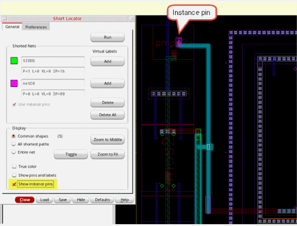 To see the instance pin that gives the selected shape its connectivity, select Show instance pins in the Short Locator form, as shown in the figure below.