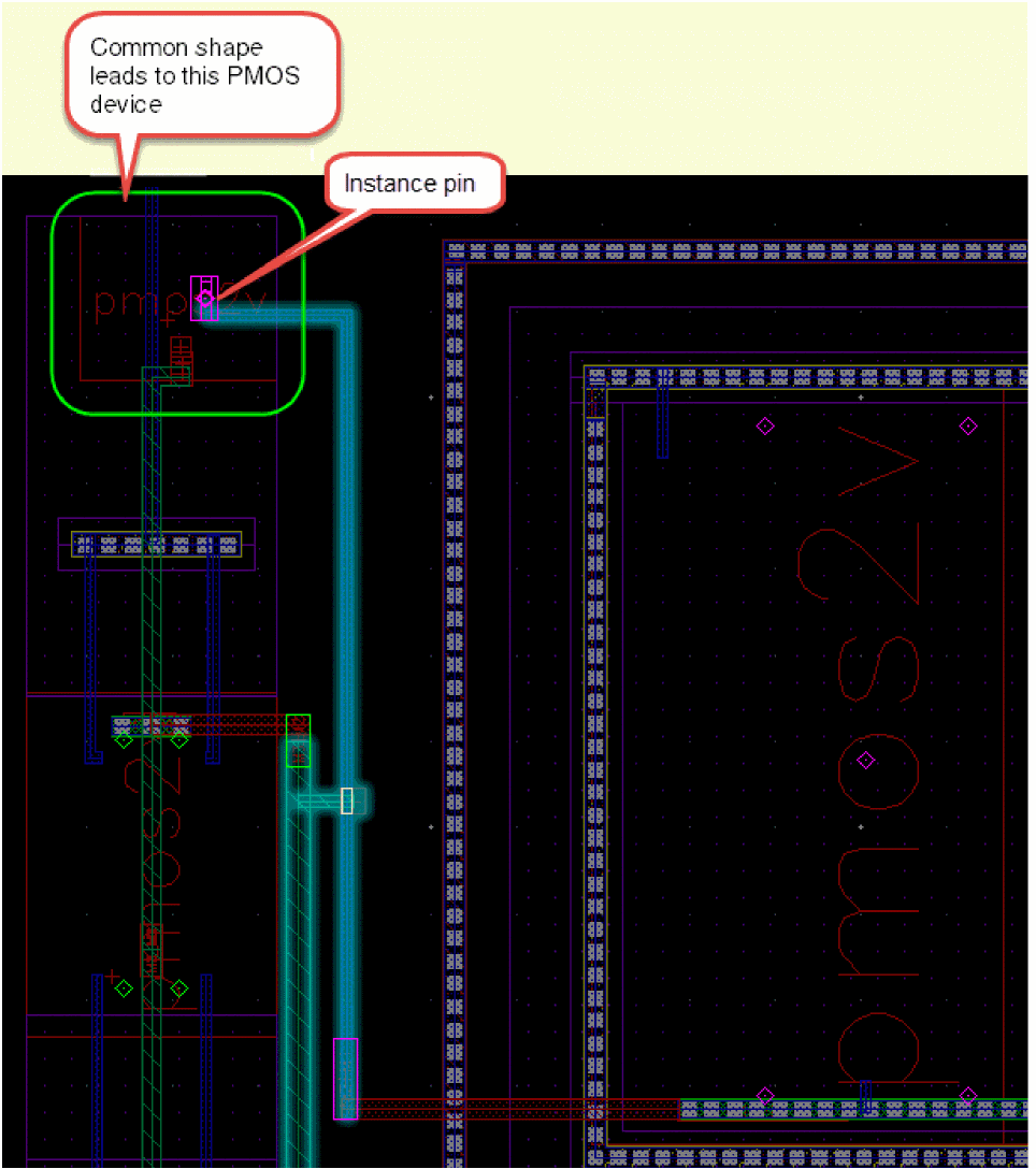 Checking the connectivity of the layout device using the Check Against Source command can confirm that the device is connected correctly. Alternatively, you can use the Property Editor assistant to verify the connectivity of the PMOS device. Also, verify that the instance is connected to the same net in the schematic view.