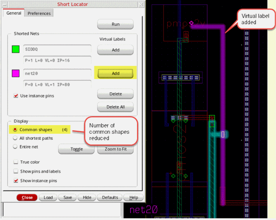 For the sample design, let us now track the connectivity of another common shape. We find that both the ends of the common shape are connected toinstTermsof known connectivity. Therefore, we can add a virtual label to the shape, as displayed in the figure below.