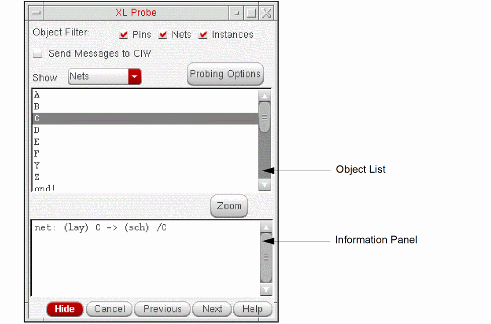 Information on the probed object is printed to the Information Panel in the XL Probe form, the relevant object is highlighted in the layout window, and its schematic counterpart in the schematic window. - Adjust the behavior as required using the options on the form.