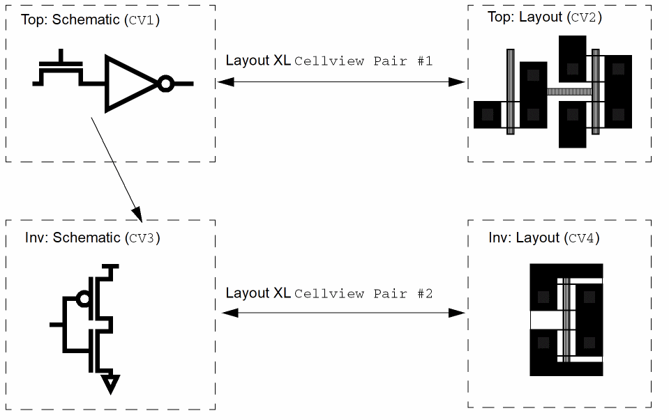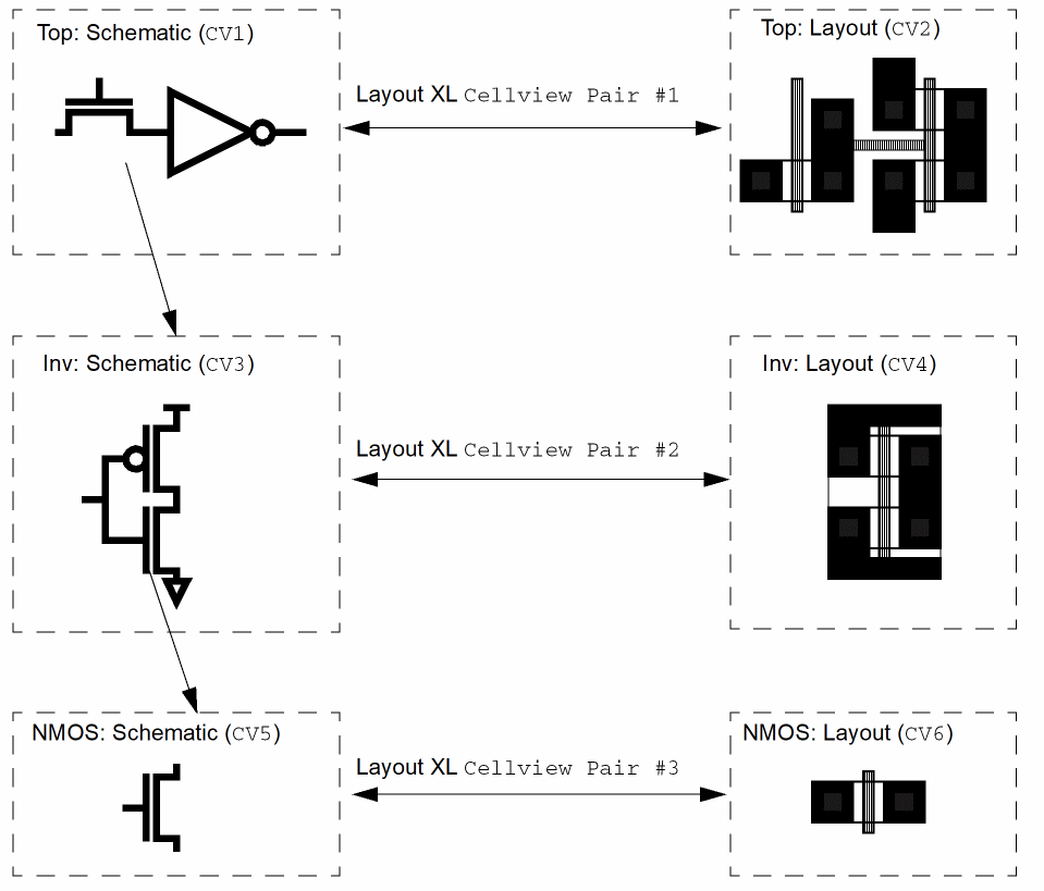 This creates another cellview pair,Cellview Pair #3. You can probe fromNMOS: Schematicback toTop: Layout,Inv: Layout, andNMOS: Layout.