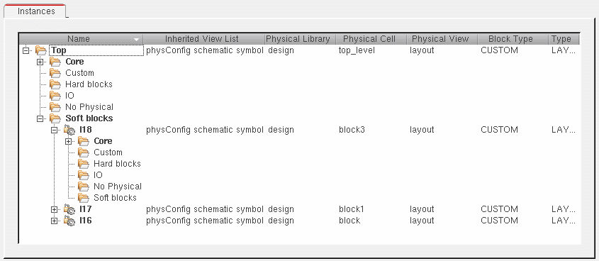 When you move into the Soft Block mode, the instances in the design are automatically moved into one of the Core, Custom, Hard block, IO, and Soft block folders based on the existence of one of the physical views specified in the Physical stop list.