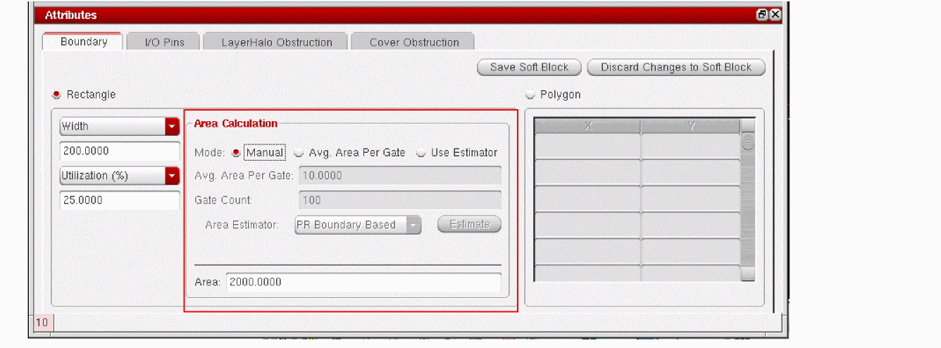- Avg. Area Per Gate lets you specify the gate count and the average area per gate. The system calculates the area by multiplying the two values.