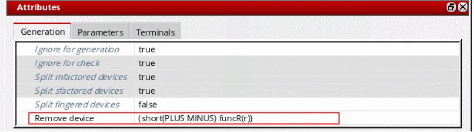 To generate a device that was earlier set as Ignore for generation, you must also disable the Remove device option to allow the device to be regenerated. Unless the Remove device option is also set to false, the nets connected to the instances are merged and the device is ignored for generation.