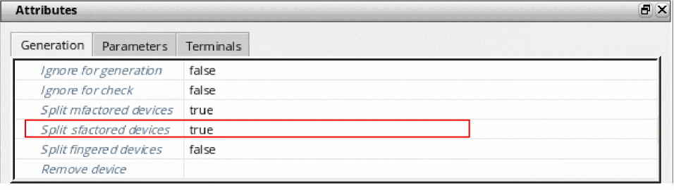 The Split sfactored devices option controls whether Layout XL places schematic devices with the sfactor property as series-connected devices in the layout or as single devices. It overrides the sfactorSplit environment variable, which can also be set on the Generation of the Connectivity form.