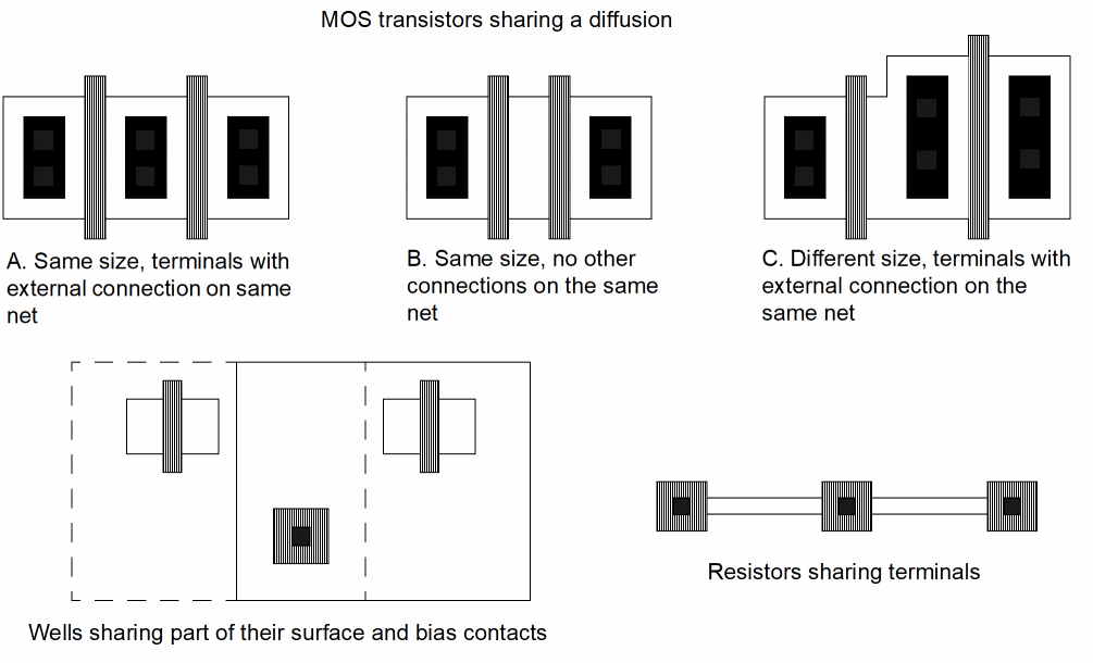 This topic describes the abutment capabilities of the Virtuoso® Layout Suite XL editor (Layout XL). Abutment allows cells to be automatically overlapped, aligned, and electrically connected without introducing a design rule violation or connectivity error. Abutment reduces both the area occupied by a circuit and the length of the interconnect wiring. You can use abutment during interactive layout generation.