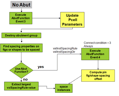 In this event, the abutment engine verifies if the pin figures or shapes have a spacing property set. If the value of that property is set to abutFunction, the abutment engine executes Event 4 using the “Connect Always” condition. This allows adjusting the wells and guard rings for the non-abutted instances. The pin figures or shapes are moved based on the value returned by the spacing property. If the spacing property is not set, the instances are not moved.