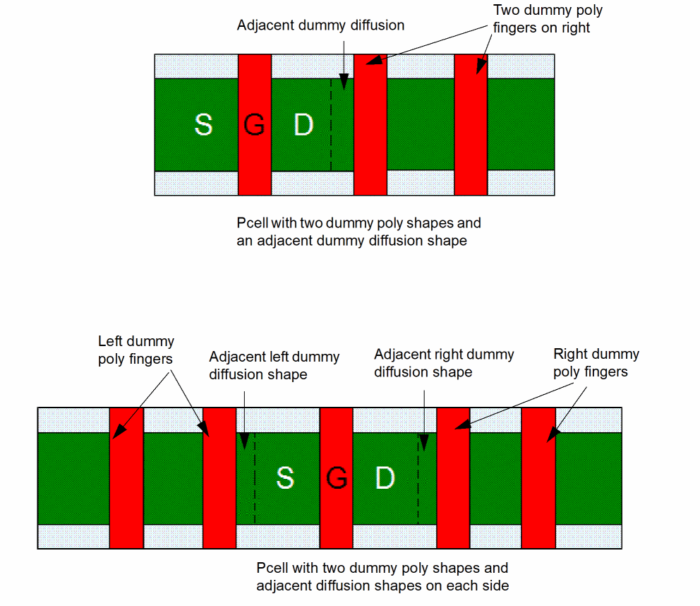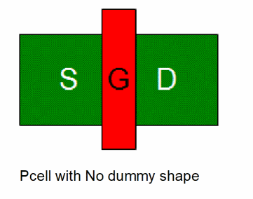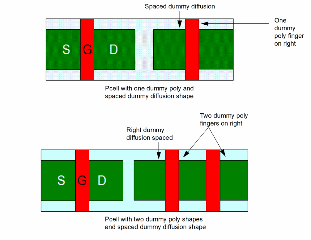 In the figure below, the Pcell at the top has a single dummy poly shape and a dummy diffusion shape added. However, that the dummy diffusion shape is added at a distance from the transistor diffusion.