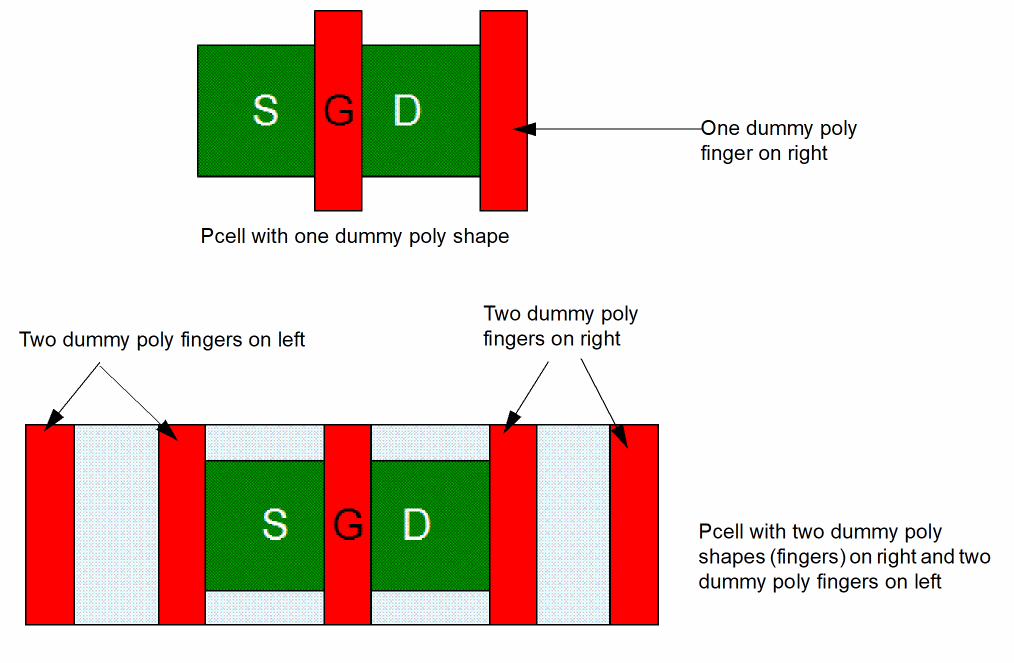 Now, let us look at some Pcell examples that have one or more dummy poly shapes and an adjacent dummy diffusion shape added. The dummy diffusion shape is placed immediately adjacent to the transistor poly or diffusion shape.