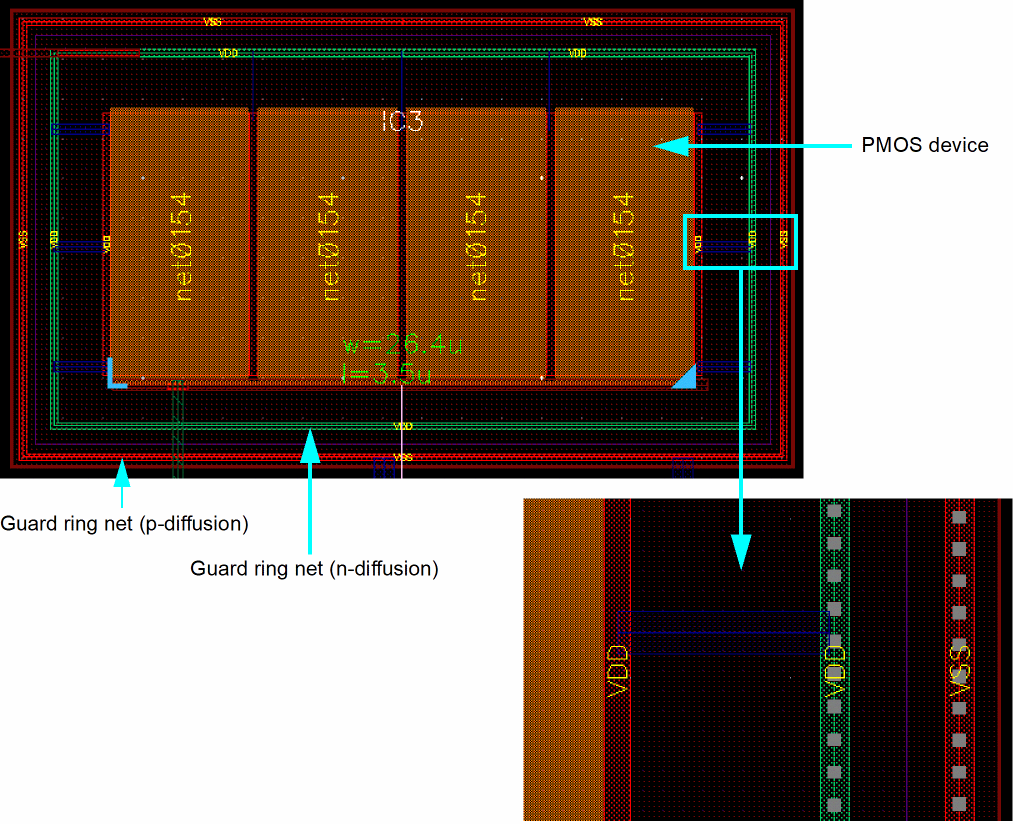 - Visible layers include diffusion and contact. The diffusion layer is displayed in green for n-diffusion guard rings and in red for p-diffusion guard rings.