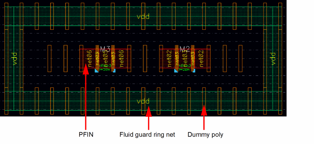 The following figure illustrates an n-diffusion FinFET fluid guard ring in Abstracted mode: