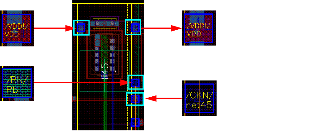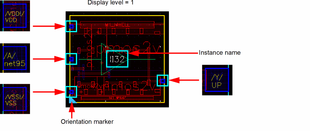 Smart Display lets you abstract pin connectivity information—the pin name and the name of the top-level net—from hierarchical blocks. Visible layers include level-1 pin layers and boundary layers. You can also view the instance name and the orientation marker for hierarchical blocks, as shown in the figure below: