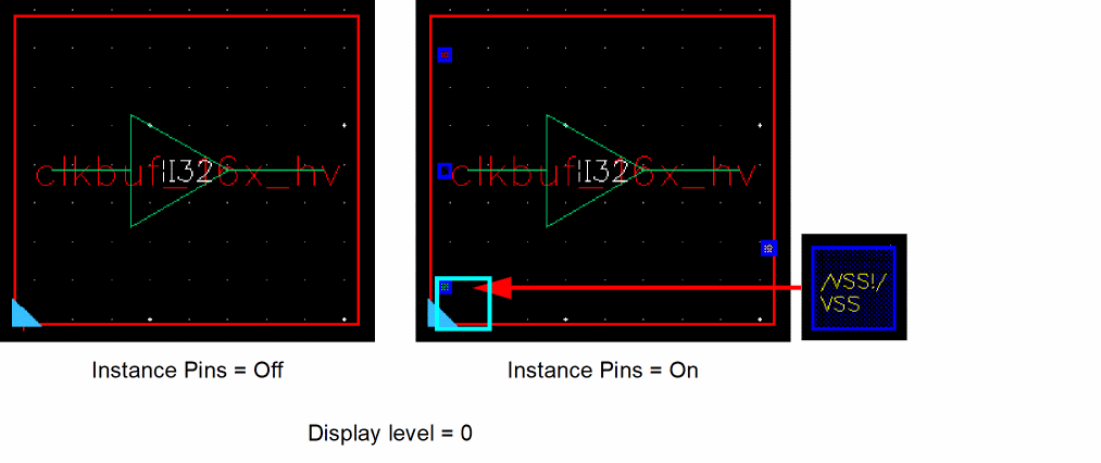 To view pin connectivity information with the display level set to 0, select the Instance Pins check box in the Display Options form.