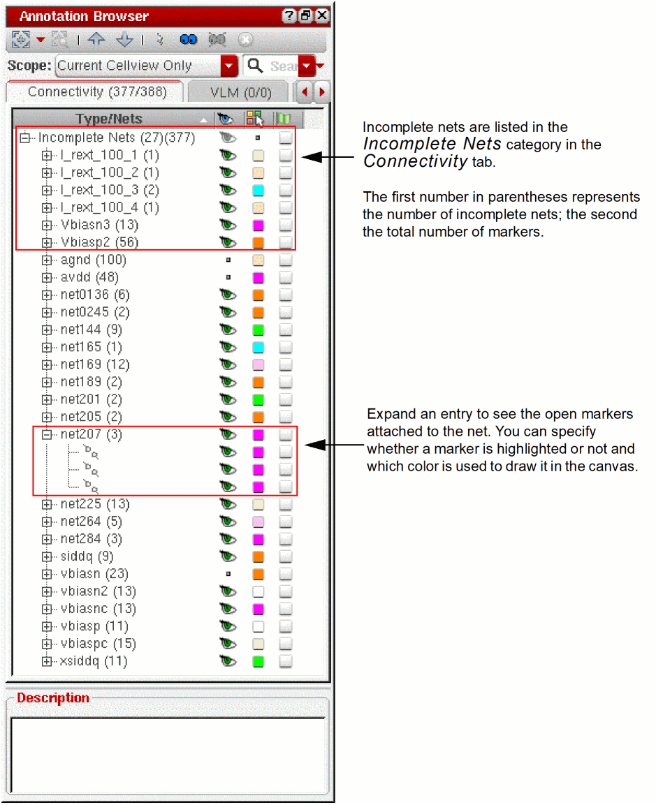 Layout XL can show you incomplete electrical connections between the component terminals, pins, and shapes associated with each net in your design. These incomplete connections include unrouted instance terminals either with no pins or with pins that are not extractable, and instance terminals with dangling must-join instance pins.