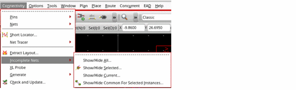 Choose Connectivity – Incomplete Nets in the Layout XL toolbar to view related commands.