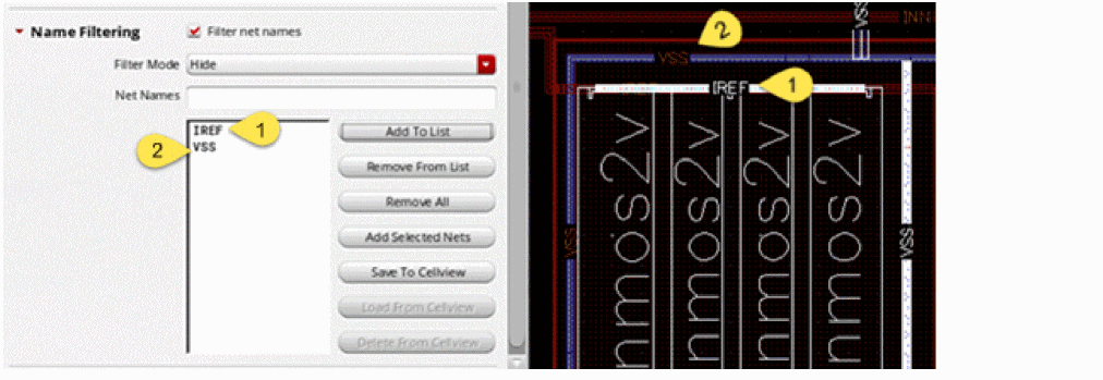In the figure below, net name filtering is enabled and the filter mode is set to Hide. This implies that the net name labels for only the specified nets, IREF and VSS, are hidden. All other nets will have their net name labels displayed on the canvas.