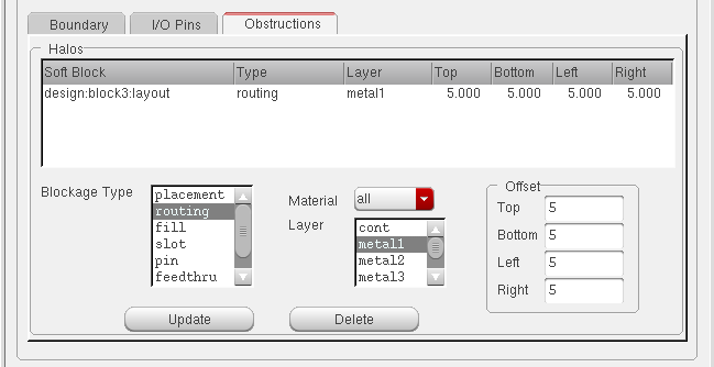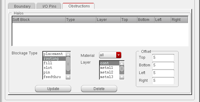 The Obstructions tab lets you add or change routing and placement obstructions implemented using layer and placement halos.