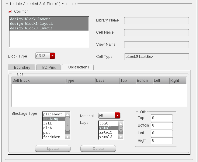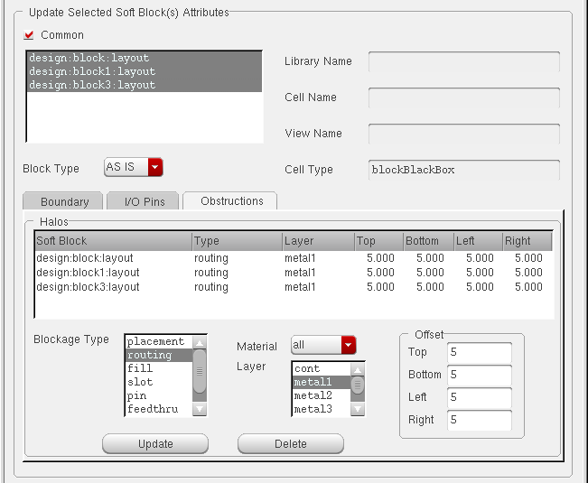 The list of extractable layers is retrieved from the constraint group set for the current layout cellview. If there is no constraint group set for the current layout cellview, the software retrieves the layers from the constraint group specified by thesetupConstraintGroupenvironment variable. If there are no layers defined in either location, it issues a message and disables soft block definition. - To define a placement obstruction, you need only set the Offsets. You can define only one placement obstruction per block.