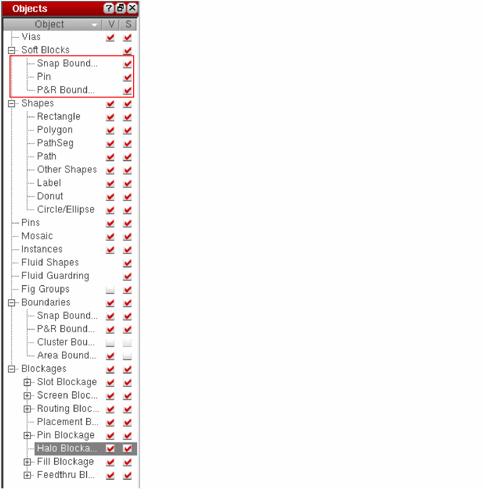 In the Objects panel, check the V and S check box to make Pins, P&R Boundary, and Snap Boundary visible and selectable. Check the S check box to make Soft Block Pins, P&R boundary, and Snap Boundary selectable.