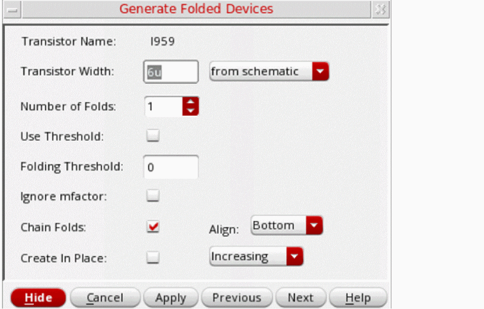 The Transistor Width field is displayed when the devices selected for folding are MOS transistors that have the Width parameter set. -