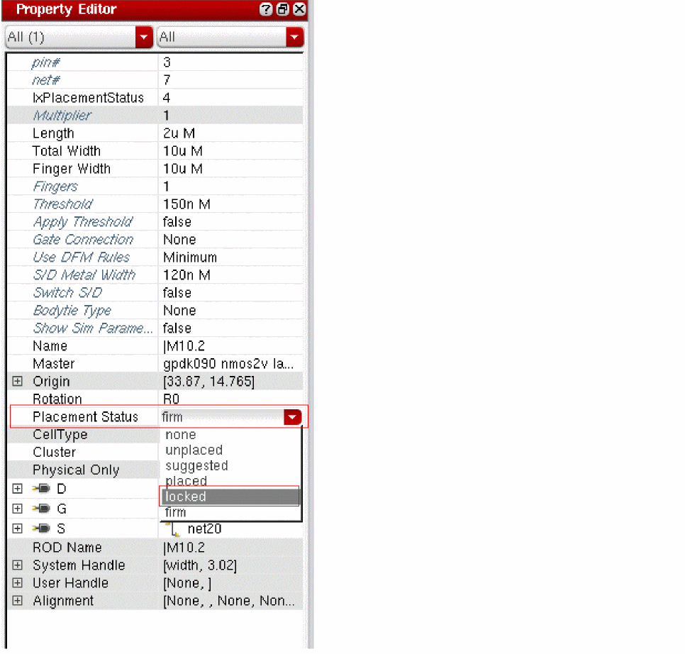 You can view the locked constraint for the selected devices in the Placement Status field of the Property Editor and Constraint Manager assistants.