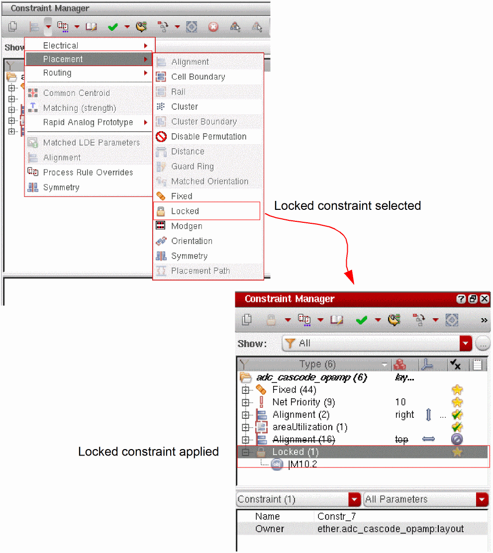 The Layout XL device locking capability sets a temporary locked constraint on a device in the layout. A locked device cannot be moved during interactive or automatic placement.