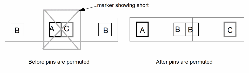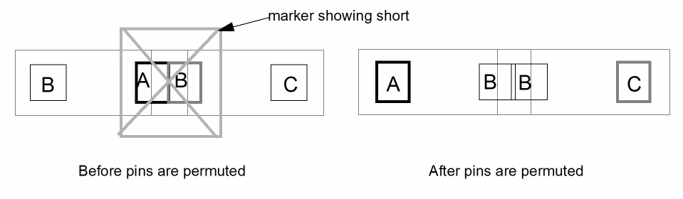 In the diagram below, two pins belonging to different nets (A and C) create a short when they are touching each other. If these pins are permutable, and reversing the pins of both components connects the two pins that are on the same net (B), Layout XL permutes them.