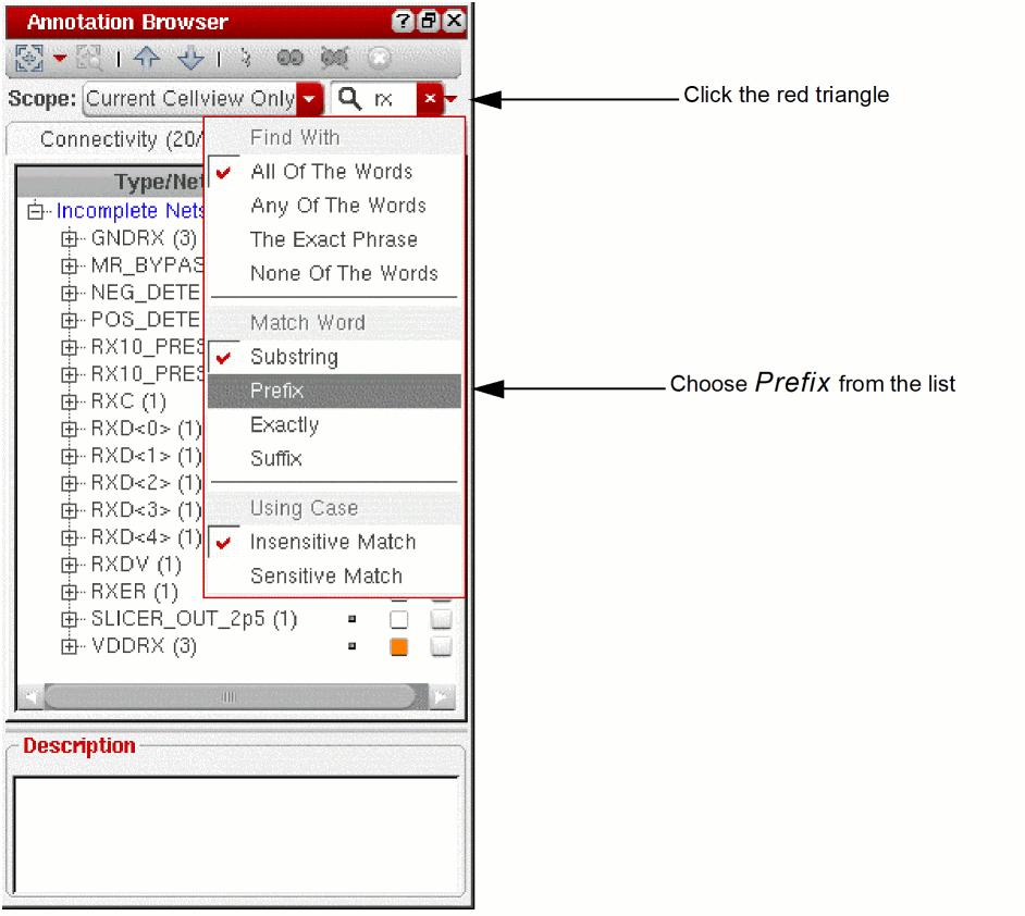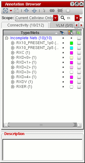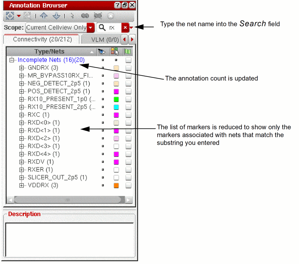 You can use the Annotation Browser Search function to locate all the incomplete net markers associated with a particular instance or net in the design. When you type in the name of a net, the browser updates automatically to show only those incomplete nets that feature that name either in the labels in the browser pane or in the messages shown in the Description field.