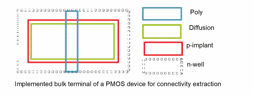 The bulk area of a transistor can be defined using a physical and extractable pin figure or using a shapeless terminal. If the bulk is implemented using a physical shape, the corresponding pin figures define the bulk area and the extractor uses the corresponding layer(s) to determine the top-level connections. If the bulk is a shapeless terminal, the bulk area of the device is usually the active layer that lies under its gate, between the source and the drain. The following figure displays the bulk area of a PMOS device, which is a physical shape on the Nwell layer.