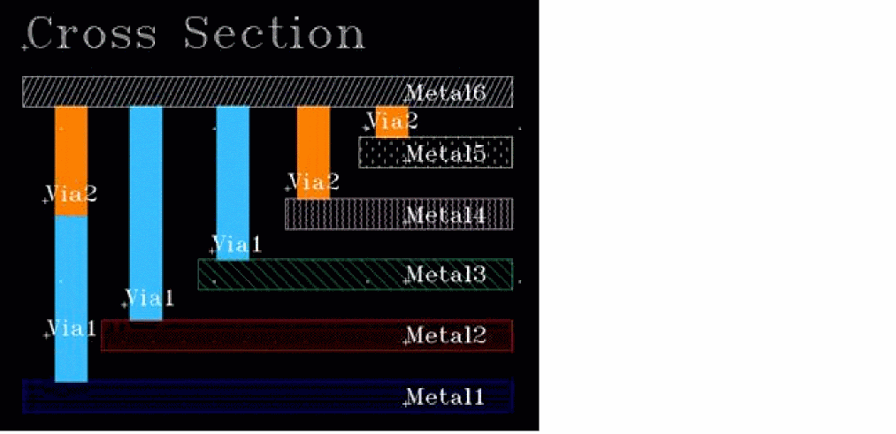 Cut layers Via1 and Via2 are required to connect Metal1 to Metal6.