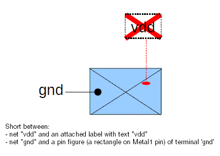 Scenario 3: If a label is attached to a pin shape that has a terminal name different from the label text, a short marker is created overlapping the label. If the label text and the terminal name are the same, no violations are reported.